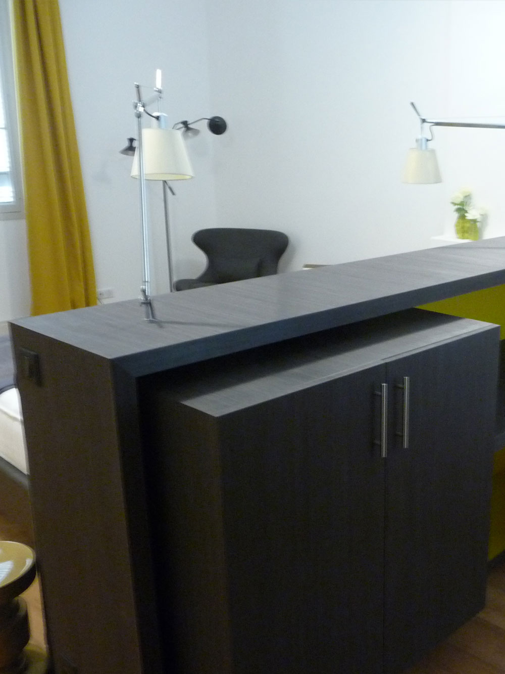 Réalisation d'un meuble double utilisation : tête de lit et bureau dans une chambre d'hôte dans le Médoc (33).