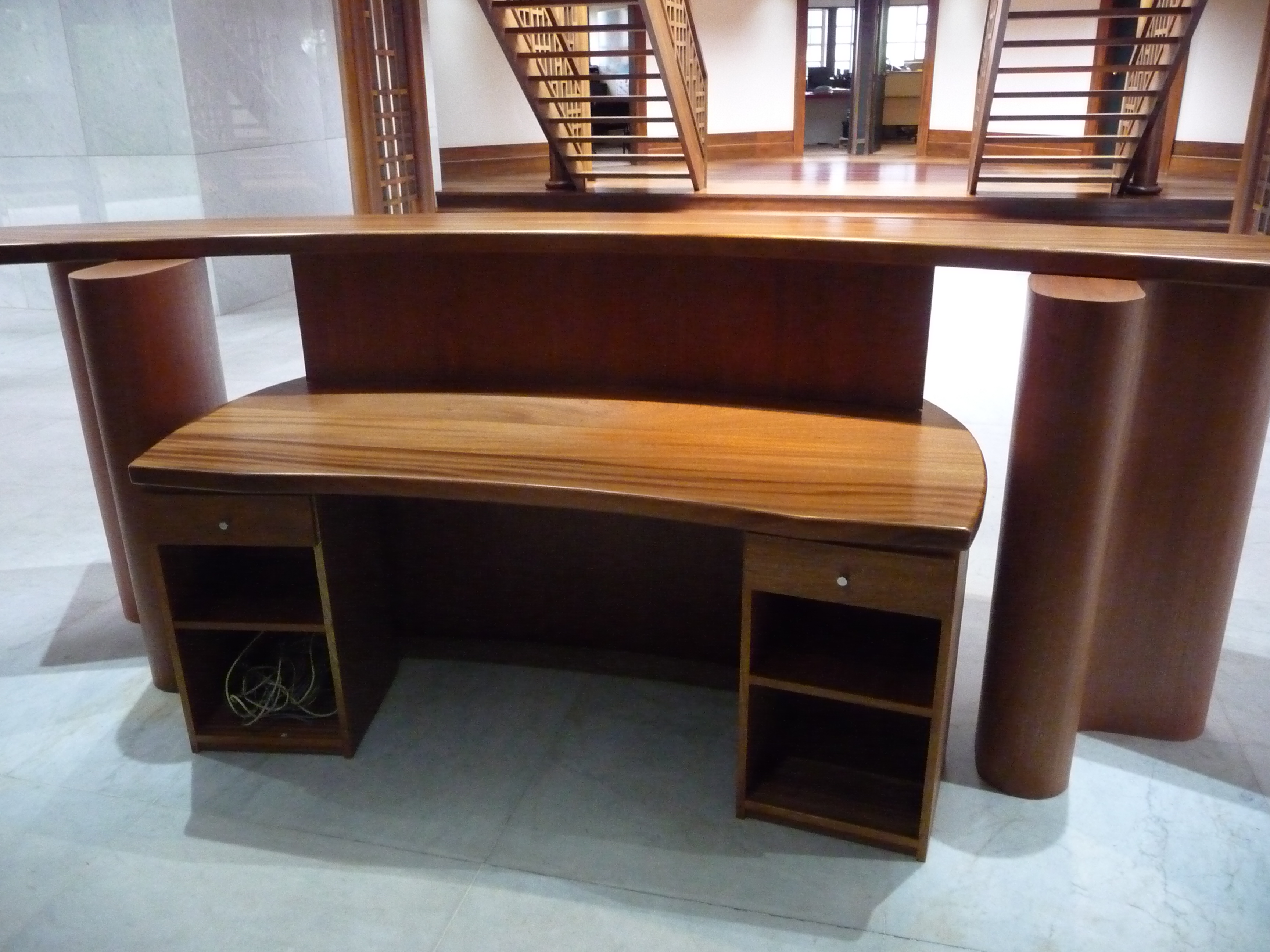 Réalisation d'une barque d'accueil finition plaçage bois exotique vernis plateau massif.