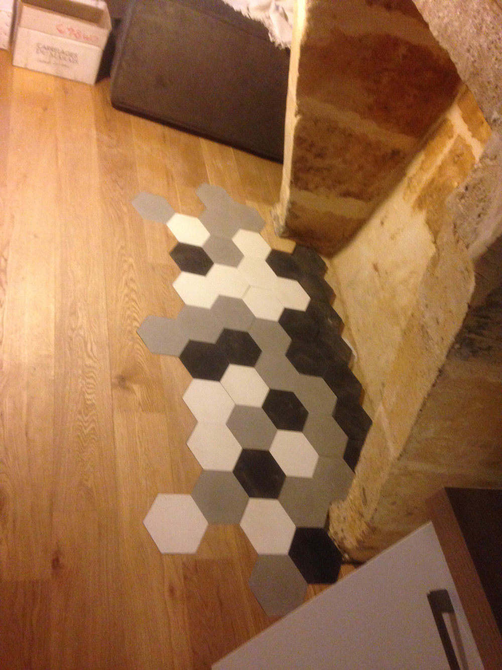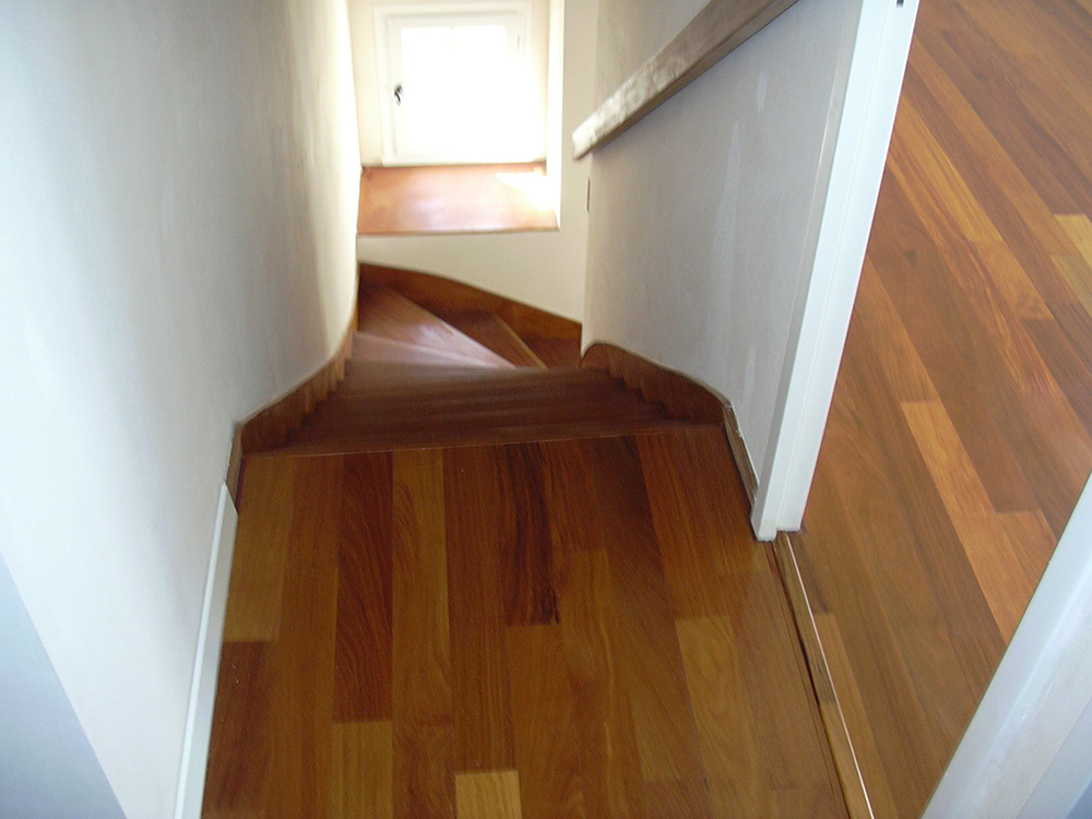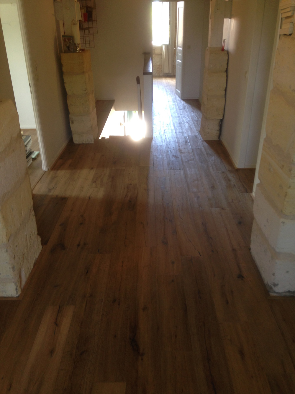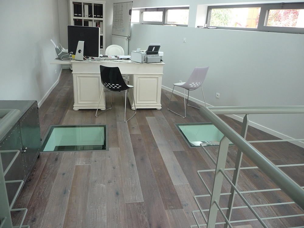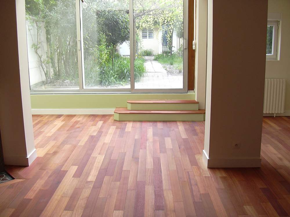 Parquet Padouk massif, pose collée, finition huilée, chantier bureau Mérignac ZI du Phare.