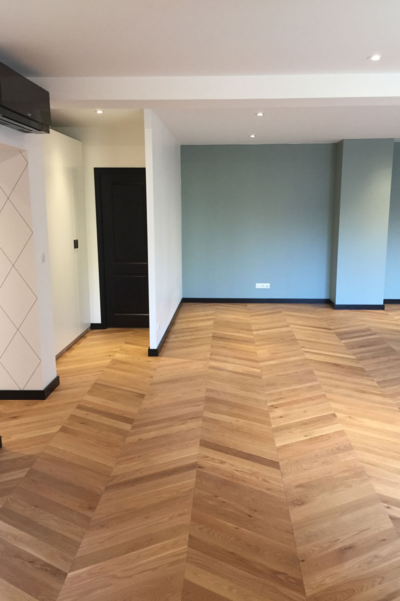 Le point de hongrie lames large finition chêne huilée se marie parfaitement au style contemporain.