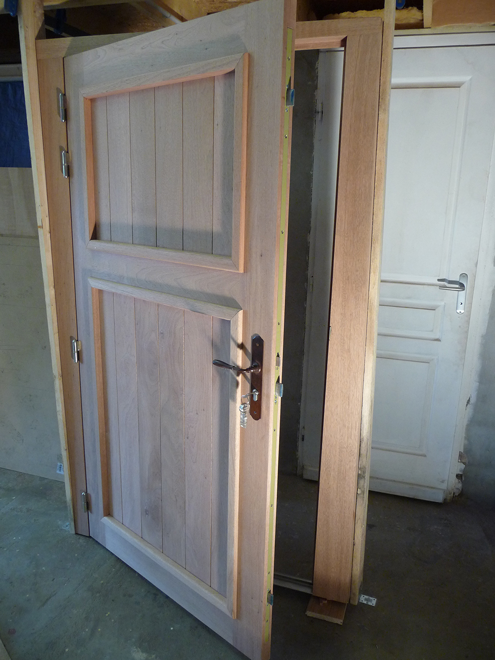 Porte d'entrée bois exotique style panneau à grand cadre, chantier à Blaye.